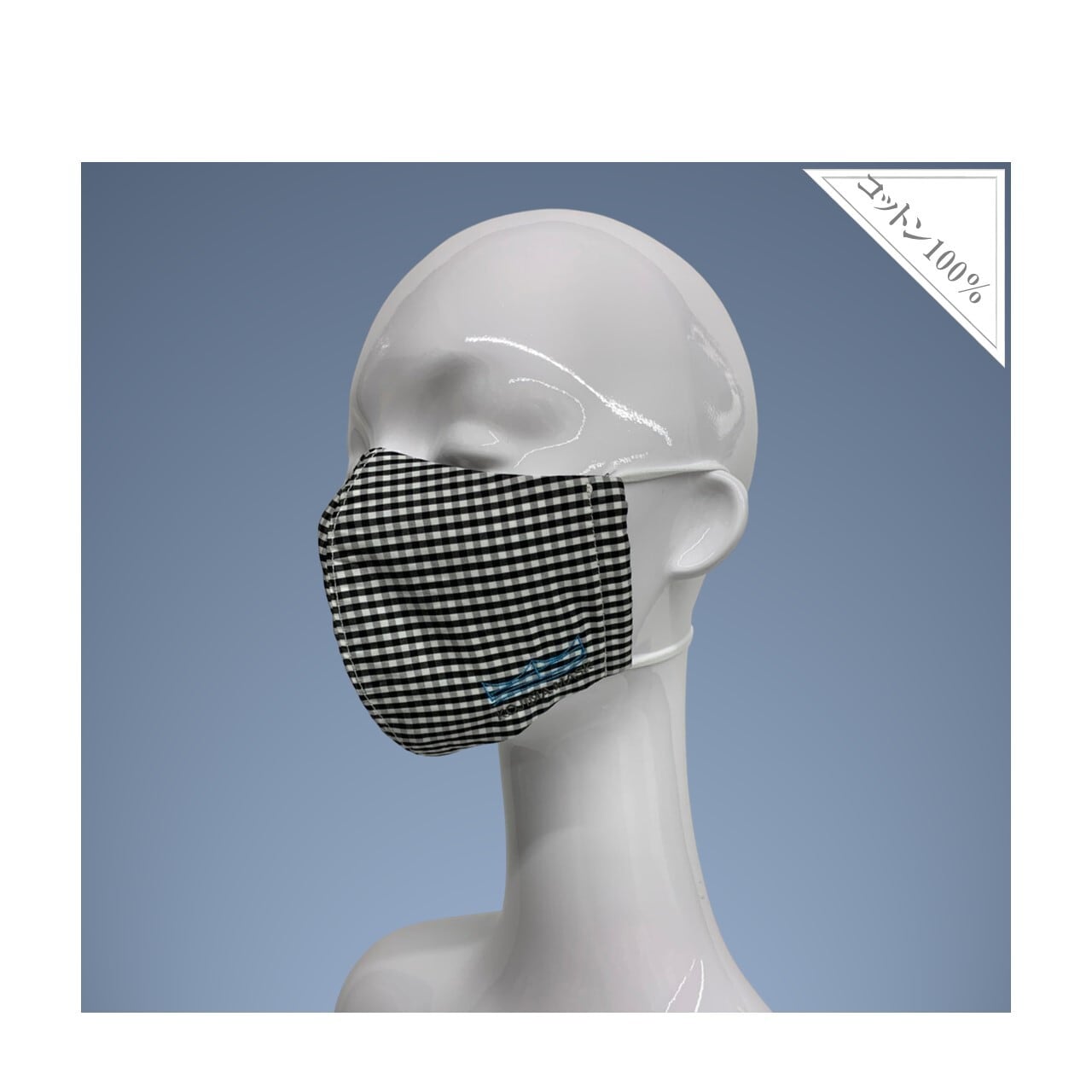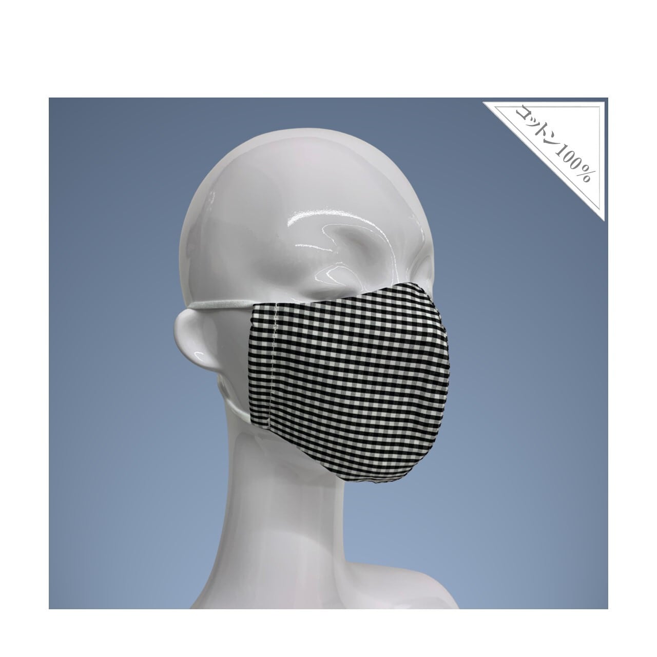 マネキン着用のマスクのひもは頭の後ろで固定させております。